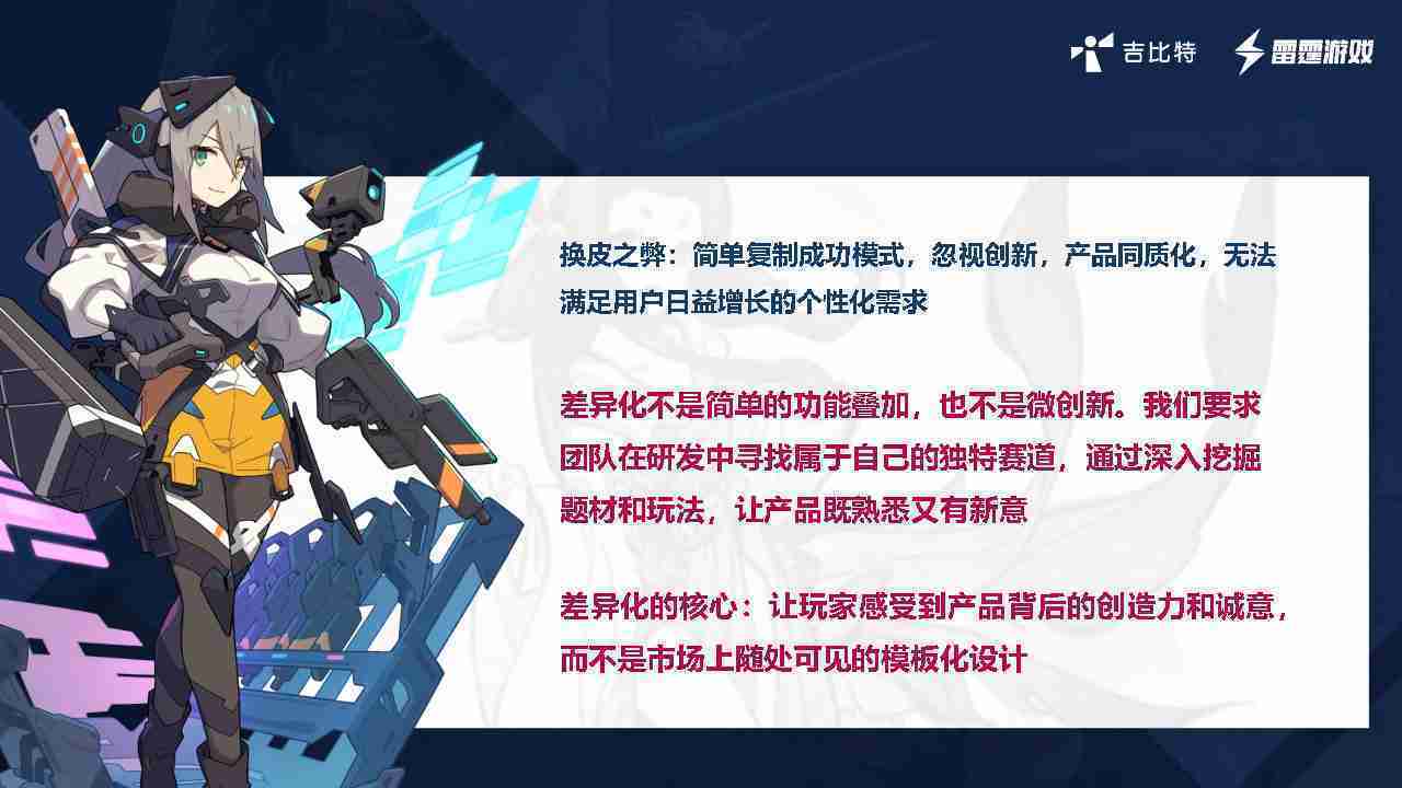 在我们内部是这么定义差异化的。。。首先,,,差异化不是简单的功能叠加,,,更不是换皮。。。只是换皮,,,产品无法提供有效的市场价值。。。内部经常说差异化的产品不是为了迎合市场,,而是找到一个自己独特的表达方式,,,在研发中找到属于自己的细分赛道和独特赛道,,,,前提是需要对这个题材有足够的深入、、、挖掘,,对玩法有足够深入的理解,,,让产品看起来既熟悉又有新意。。。