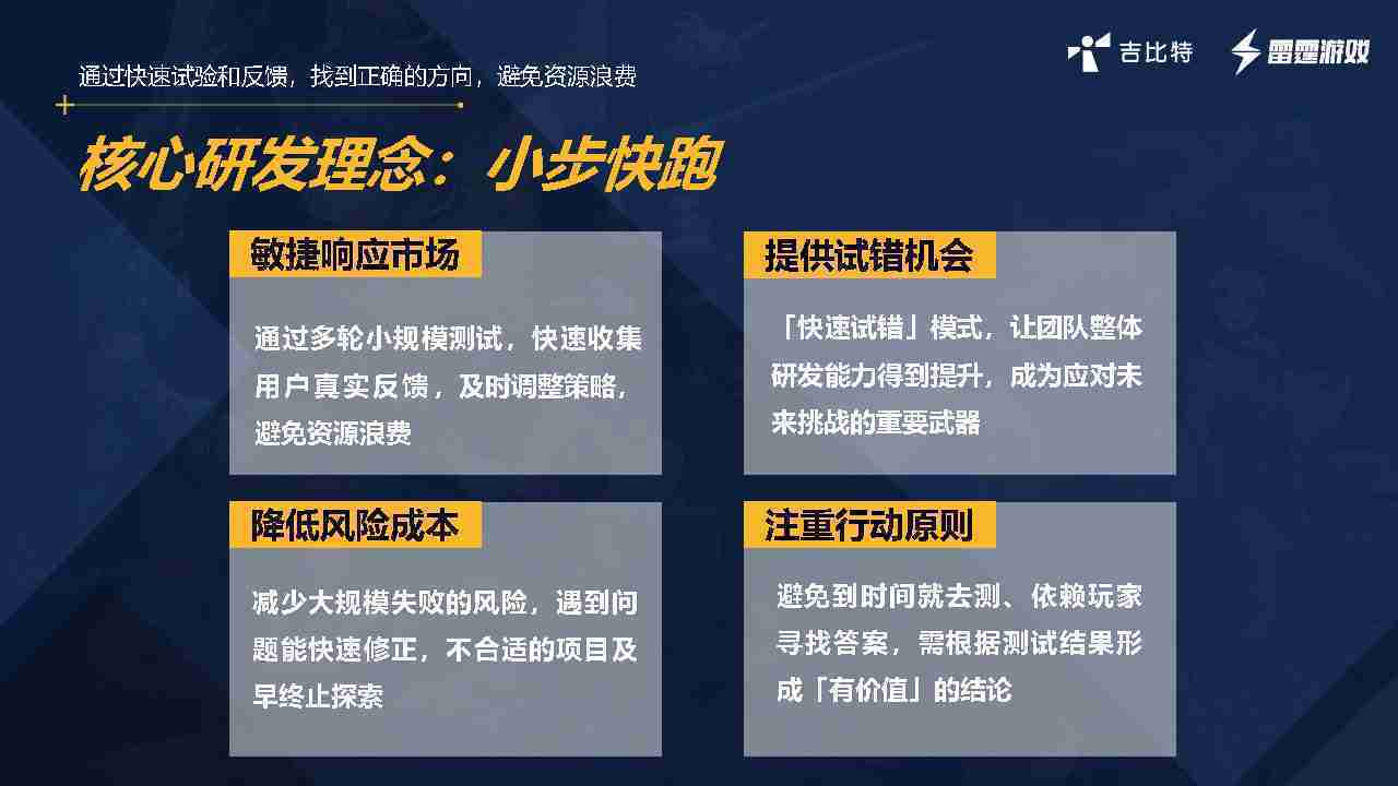 小步快跑不是找答案,,,而是验证答案。。我们之前有项目是这样的,,,有些制作人会有几个方向觉得都可以做,,,但是不确定做哪一个,,,,会选择几个都做,,,,做完拿到市场跑,,,跑出哪一个更好,,,基于这个再做后续的研发和拓展。。。。但这种情况最容易出现一个问题,,可能被玩家裹胁,,,玩家说这个点不错、、那个点不错,,,到底听还是不听,,,不听感觉是无视玩家的反馈,,,听的话,,,,可能自己没想清楚导致研发思路发生偏颇。。所以针对这一点后面自己复盘整理,,,发现制作人自己心里要有数,,,,要做自己觉得好玩的,,,而且明确知道这个东西是你想做的,,,,然后拿到市场验证这个答案是不是对的,,,而不是拿一堆答案找哪一个答案更好。。。。