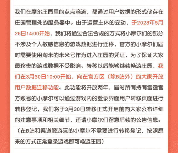 合作结束本就是开发方和代理方双方的事情,,,,降低这件事情对玩家的影响,,才是对所有珍视这段童年的摩尔玩家最好的呵护。。。。目前看来,,,用户完全不用担心后续因无法登录游戏而造成任何数据上的损失,,只要及时进行账号转移,,,,就可以好好保留、、、、延续在庄园的痕迹和回忆,,继续在庄园里做快乐的红鼻子小鼹鼠。。。