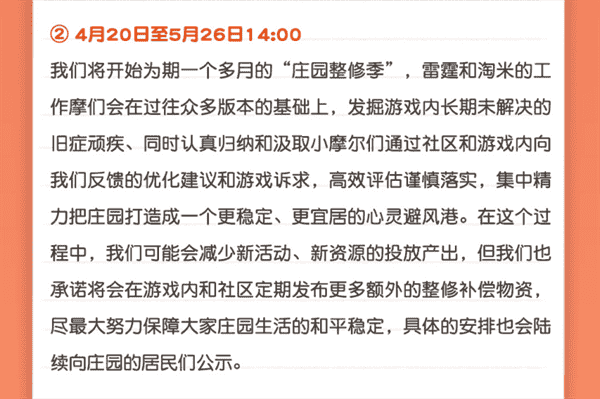 合作的结束并不意味着这个童年IP的结束,,,,对于《摩尔庄园》手游而言,,,,这是一个新阶段的开始。。后续游戏内将开启庄园重构计划,,,,会就以往遗留下来的BUG进行集中修复,,并在游戏内和社区定期发布更多补偿物资。。。