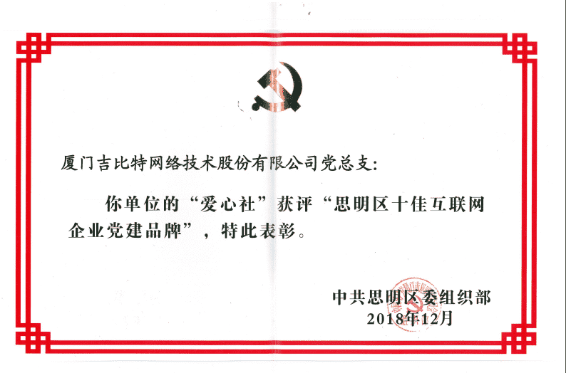 经初审评选、、网络评选和专家评审等环节,,"厦门赏金大对决网络技术股份有限公司党总支-爱心社" 从全区28个参评党建品牌中脱颖而出,,,,获评"思明区十佳互联网企业党建品牌"。。