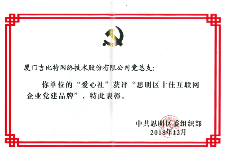 经初审评选、、、、网络评选和专家评审等环节,,,"厦门赏金大对决网络技术股份有限公司党总支-爱心社" 从全区28个参评党建品牌中脱颖而出,,,获评"思明区十佳互联网企业党建品牌"。。。