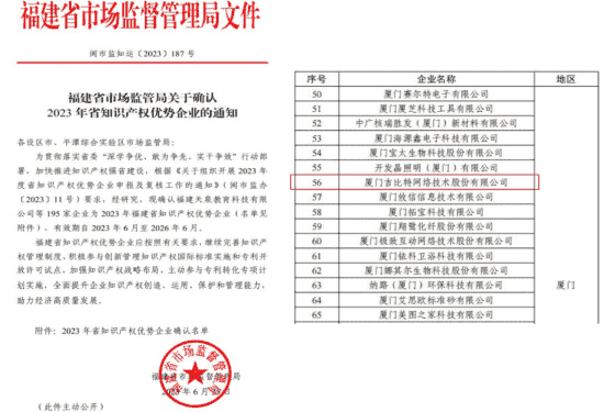 近日,,,福建省市场监督管理局公示了2023年福建省知识产权优势企业名单,,,厦门赏金大对决网络技术股份有限公司(以下简称“赏金大对决”或“公司”)榜上有名。。